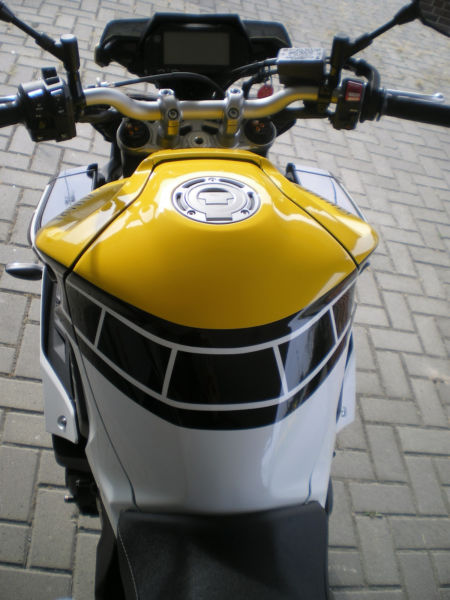 Das ganze würde ich mal auf dem matten ABS probieren und auch auf einem glänzend schwarzen Flügel. Den silbernen Streifen würde ich mit dem MT Logo wie beim original Seitendeckel enden lassen.Ich will nichts Vorenthalten