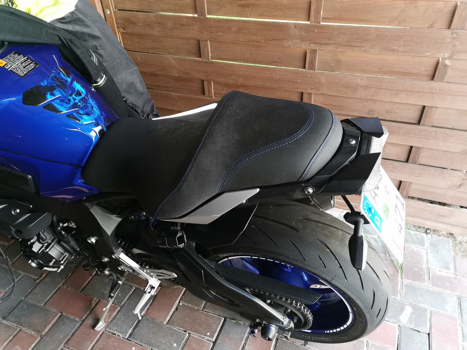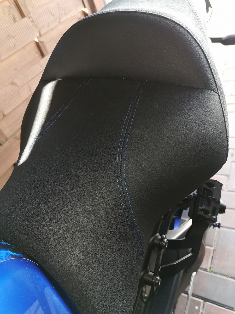 .....Ich hab meine noch ganz schlicht gehalten nur mit blauen Ziernähten, passend zum Mopped. In der Mitte hab ich rutschfesten Belag genommen. Die Rückenstütze hätte man auch noch besticken lassen können, allerdings gegen Aufpreis.