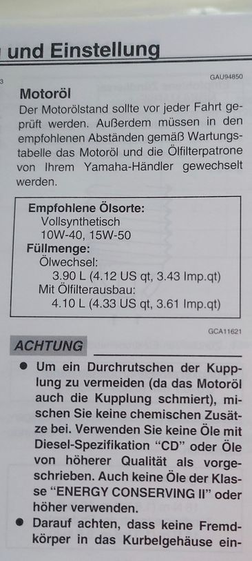 BikergrussBeitragRE: Vollsynthetik ein Muss?Das auf dem Bild hab ich als Rest bekommen. Das wurde eingefüllt. Hole jetzt Vollsynthetisches Öl und wechsle selbst. Filter lass ich drin.