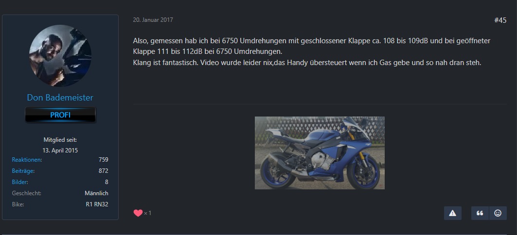 Nachdem ich wieder lesen musste das die MT-10 (RN78) zu leise ist, erinnere ich mich wieder an ein Ereignis, beim hinterher fahren (wir hatten die gleiche Richtung) mir wurde fast schon schlecht von dem Lärm/Druckwelle, ich sah noch das der Fahrer anhielt, nahm den Helm ab und die Stöpsel aus den Ohren, seine Maschine (Harley) hatte fast außer Krümmer nichts mehr dran!