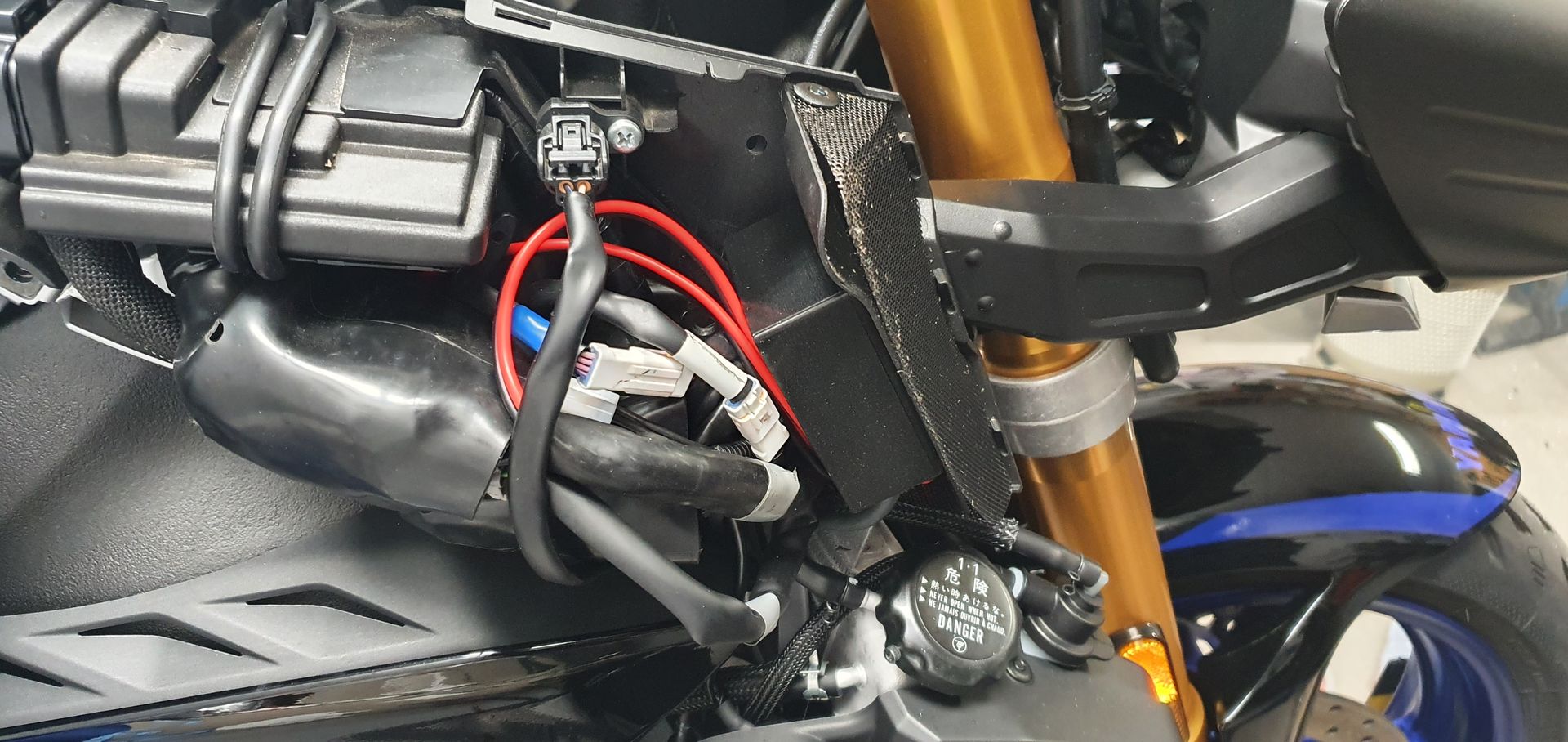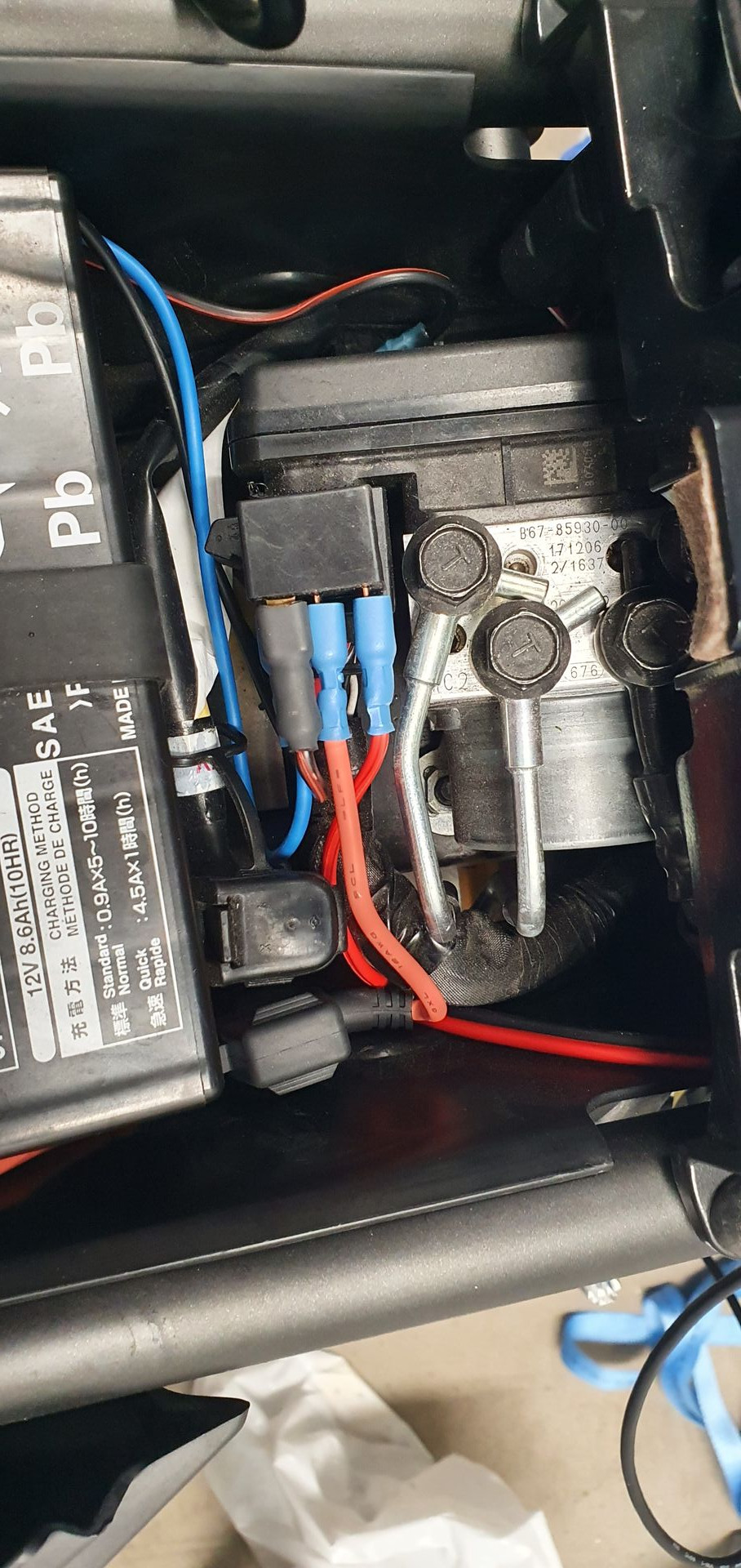Ich hab im Netz von der Alternative mit Schaltrelais gelesen und die gleiche Lösung für meine Installation gewählt. Plus und Minus mit dem linken Kabelbaum, durch die linke Lufthutze unter der linken Verkleidung unter die Sitzbank verlegt, wo das Relais und jetzt auch die zusätzliche Sicherung für die Griffheizung sitzt. Hier kommt man auch sehr gut an diverse Leitungen dran.