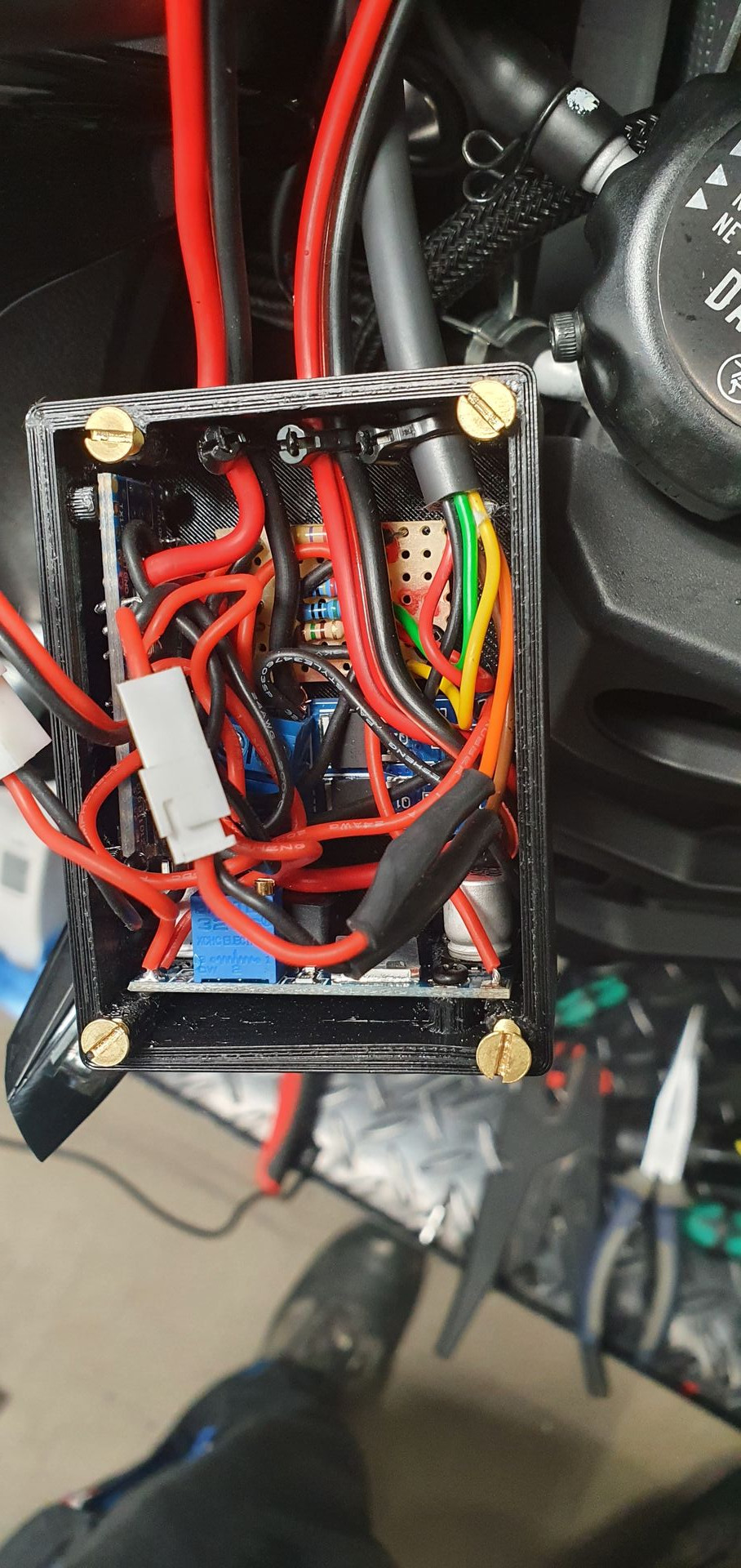 Dann habe ich mir gesagt, egal machst du mit Relais von der Batterie. Hatte noch eines da aber mit 80A etwas gross dimensioniert... ok, bestellst ein kleineres... böse Überraschung, fand für KFZ nur so riesige Klopper... dann ist mir eingefallen, ich habe ja noch einen Kabelbaum für eine SC57 mit allem dran und tada, ein kleines süsses Relais.