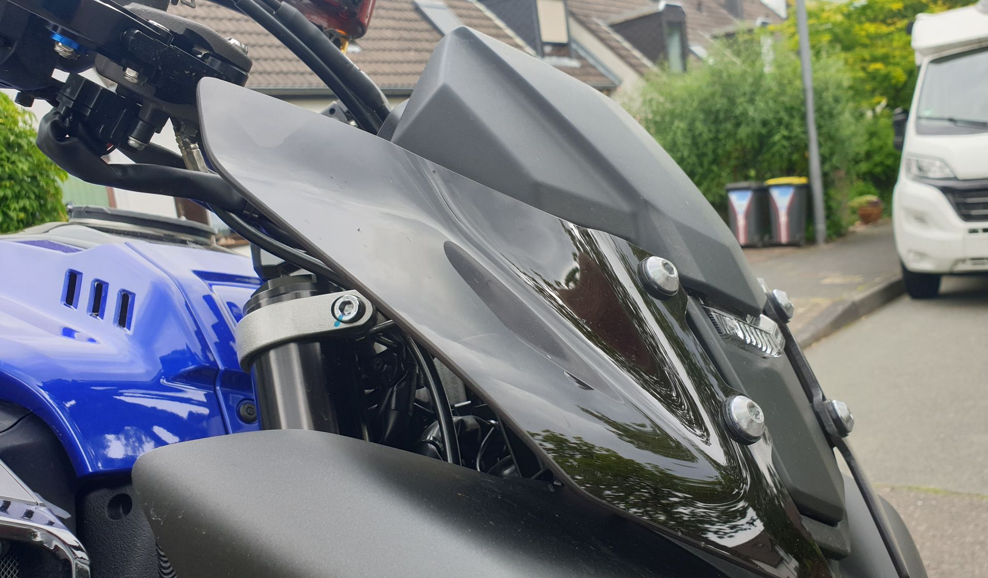 2 Bilder mit orginal Yamaha Windabweisern. Gefällt mit besser als die Orginal Scheibe, bietet aber bei höheren Geschwindigkeiten weniger Windschutz als die erstaunlich effektive original Scheibe.