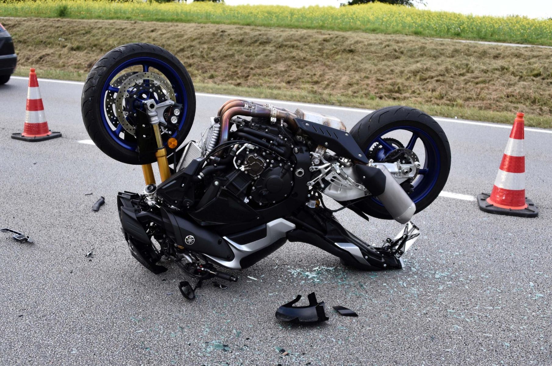 Die Federbeine sind komplett gerade, Rahmen nicht verzogen oder gebrochen, Nachlauf und Radstand passt auch und sonst war nur die Verkleidung und der Scheinwerfer kaputt. Die Spiegel haben den Überschlag zum Glück abgefangen, und den Tank gerettet.