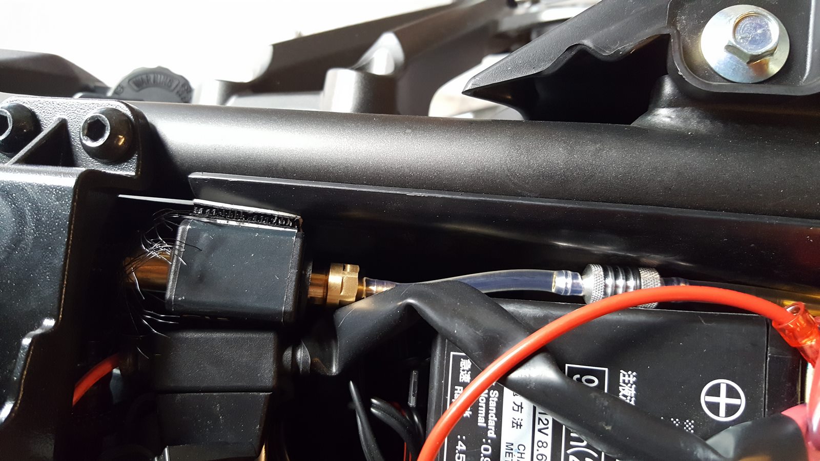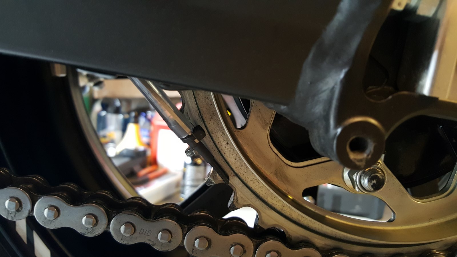 Habe die Leitung so gut es ging unsichtbar von der rechten Seite nach links geführt, Schwingeninnenseite und mit den mitgelieferten "Klemmböcken", die mittels Sekundenkleber befestigt werden zum Kettenrad verlegt. Ist ne ziemliche Frickelei, aber es lohnt sich wenn man vom Öler dann nichts mehr sieht.