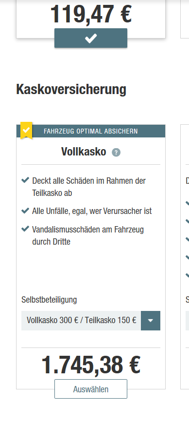 160PS, ganzjährig, 15.000km, SF10 (angenommen) Haftpflicht + Vollkasko: 1.864,85€