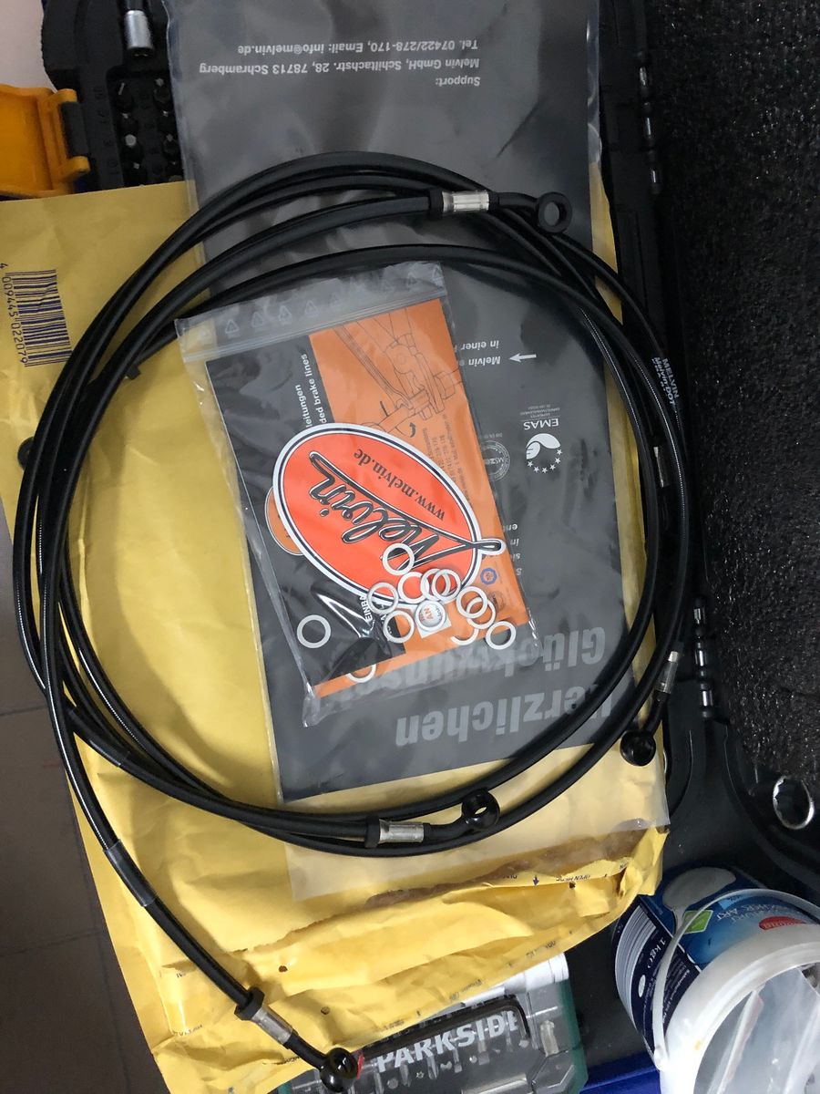 Heute sind die Melvin Schläuche angekommen. 1x Kurzer und 2 längere Schläuche dabei. Das vom ABS-Block fehlt. Muss nochmal ne Mail schreiben....