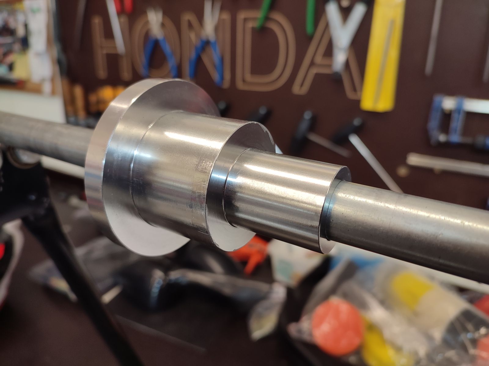 Problem 1) der Abdrück-Arm wird vermutlich auch dauernd heraus rutschen, wenn ein Reifen fest auf der Felge sitzt. Ich habe das Vierkant-Profil fest geschweißt.Problem 2) Der Felgenstopper mit dem Gummiüberzug stößt bei der MT-10/R1 an die Bremsscheibe, was einen Verzug mit sich bringen kann. Diesen habe ich deutlich im Durchmesser abgedreht und mit Panzertape sauber abgeklebt, damit die Felgen keine Macken bekommen.