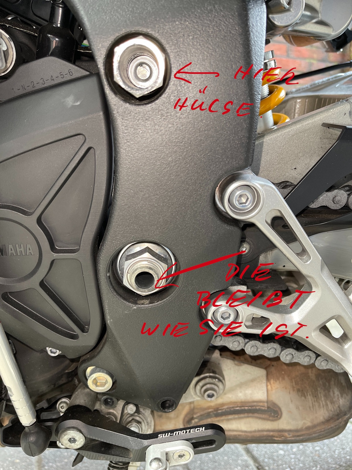 Die obere Schraube ist durchgehend und muss umgedreht werden. Die Hülse ist mit einem Gewinde versehen und wird von der rechten Seite aus mit der umgedrehten Schraube festgeschraubt. Beim lösen der Hauptschraube verrutscht nichts also einfach lösen, umdrehen und wieder festziehen anstatt der Mutter nehmt ihr nur die Hülse.