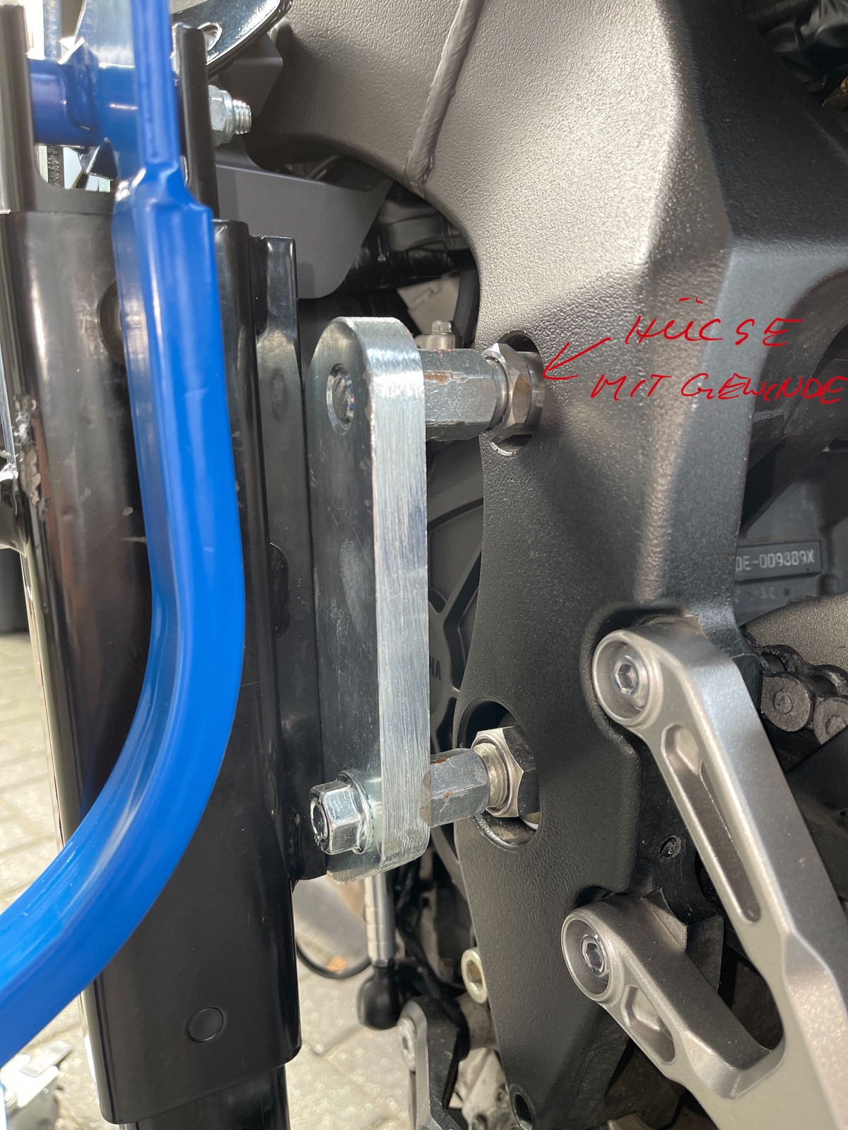 Ich habe alles lose montiert. Den Ständer rangeschoben, eingefädelt, leicht nach oben drücken und dann mit dem 16er leicht fixieren. Dann den Ständer vom Bike wegnehmen und alles Schrauben festziehen. Da sollte sich nichts verschieben.