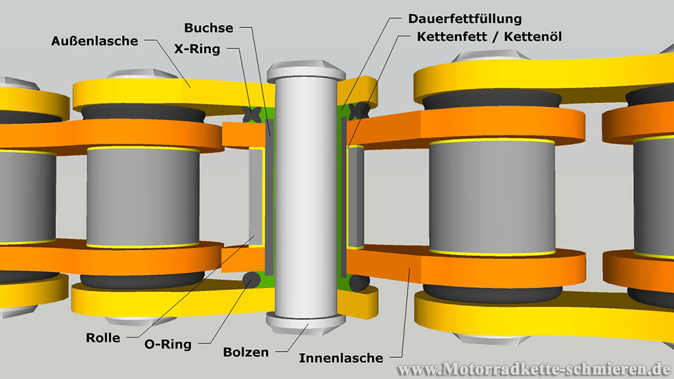 Das Öl/Fett soll ja nicht zu den Bolzen der Kette durchdringen, da dort ja eine Dauerfettfüllung vorhanden ist. Die Reibung zwischen Kettenrad und Kette sowie zwischen Rolle und Buchse soll damit verringert werden.